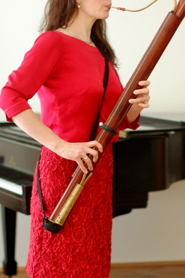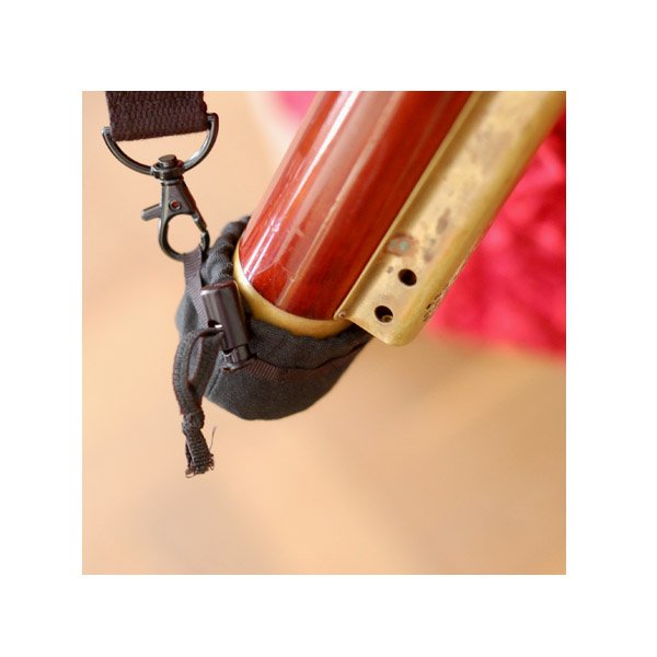 Speziell für Dulzian-Spieler hat Marillon diesen diagonalen Gurt entwickelt. Ein einfacher „Köcher“ mit verstellbarer Weite hält den Fuß des Instruments. Der Gurt wird über die linke Schulter geführt. Eine entsprechende Polsterung sorgt für den nötigen Tragekomfort.
