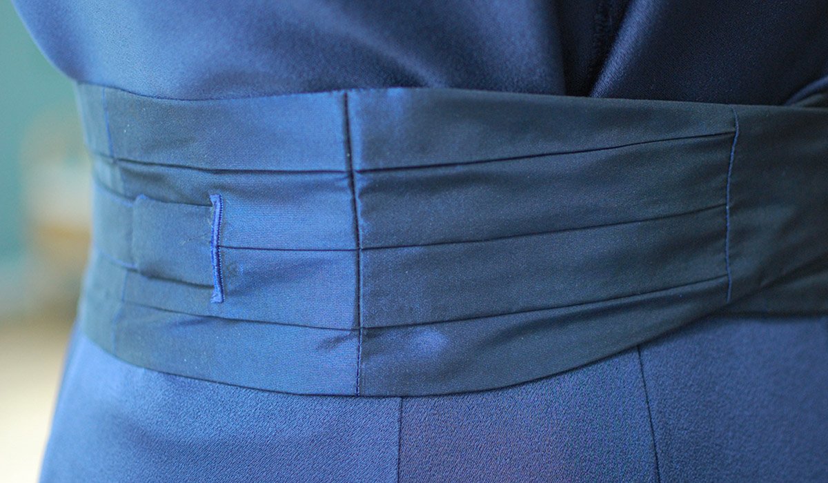 Der Gürtel wird gewickelt und hinten gekreuzt. Dabei muss eines der Bänder innen geführt und über ein Knopfloch wieder nach außen geholt werden, sodass die langen Bänder vorn geknotet werden und nach unten fallen. Es ist aber auch möglich, die Bänder innen zu verschränken, sodass vorn nur der in Falten gelegte Gürtel zu sehen ist.