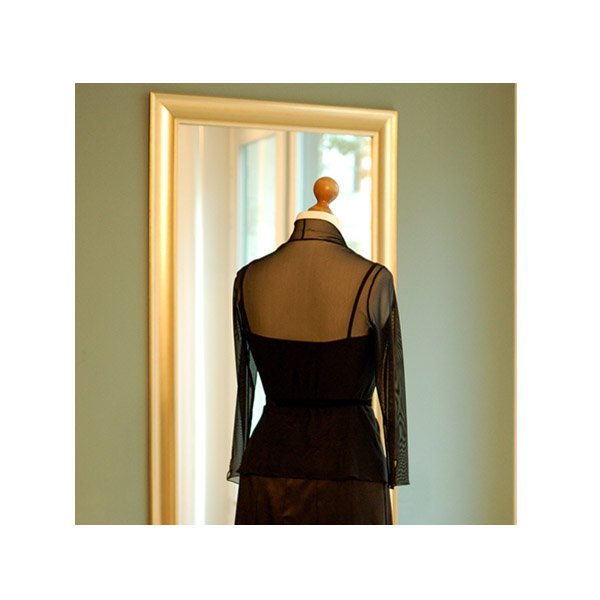 Ein kurzes Jäckchen mit rund auslaufendem Stehkragen, das verschiedene Outfits komplettieren kann. Spitz zulaufender Ärmelabschluss mit Schlitzen. Das Besondere dieses Jäckchens ist das superelastische Material. Somit hat die Trägerin – trotz des klassischen Schnitts mit Jackenärmel – maximale Bewegungsfreiheit im Rücken.
