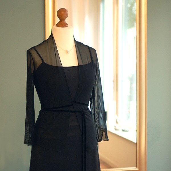 Transparentes Jäckchen aus elastischem Material mit anliegendem Kragen. Dreiviertelärmel mit kleinen Schlitzen. Schmale Gürtelbänder zum Wickeln.