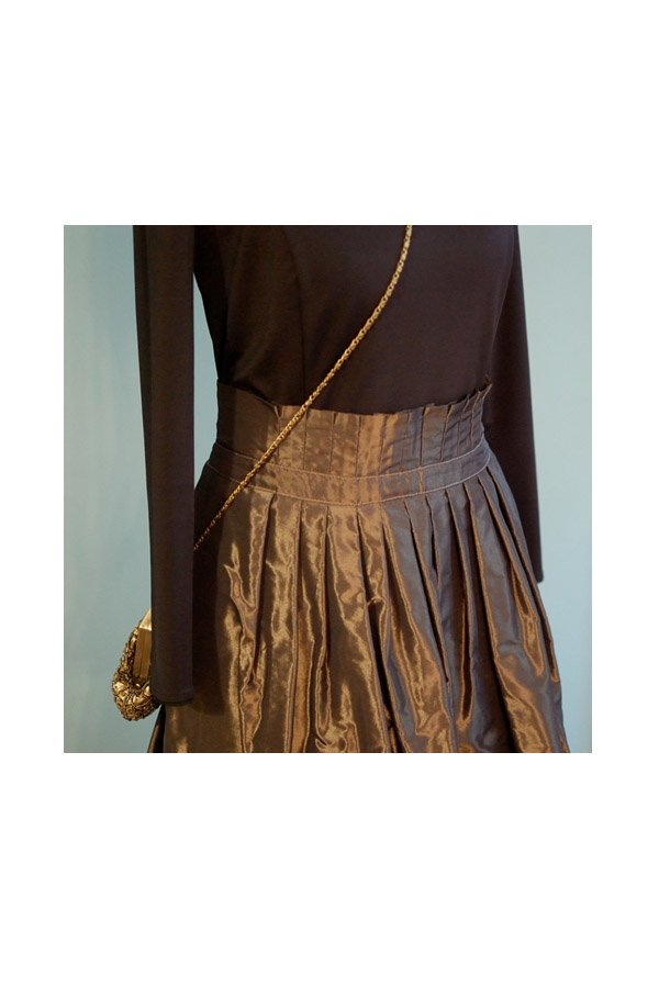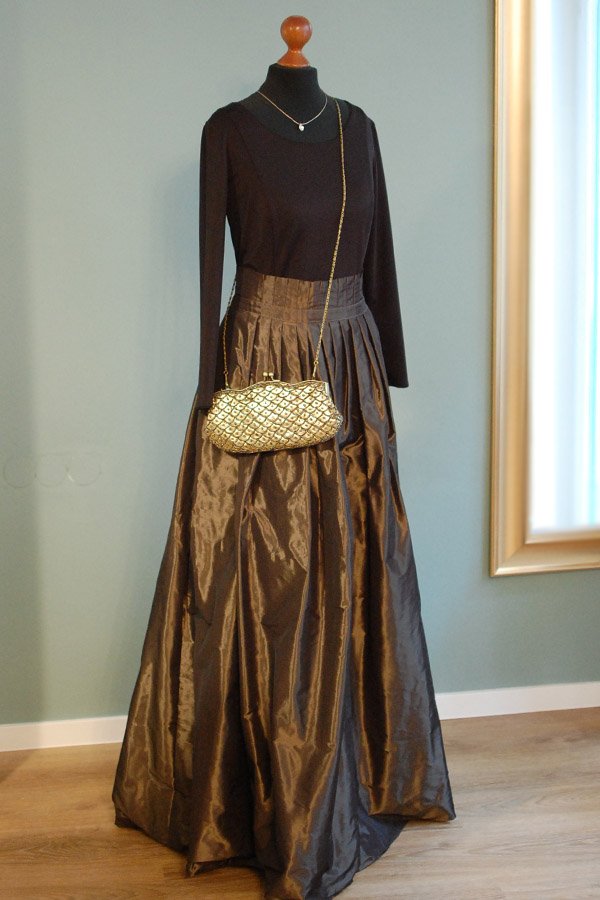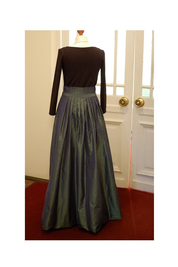 Bodenlanger, weiter Rock aus changierendem Taft. Die Falten des Rockes werden durch ein Gürtelelement optisch gefasst. Der Reißverschluss befindet sich in der Seitennaht. In verschiedenen Farbvarianten möglich.